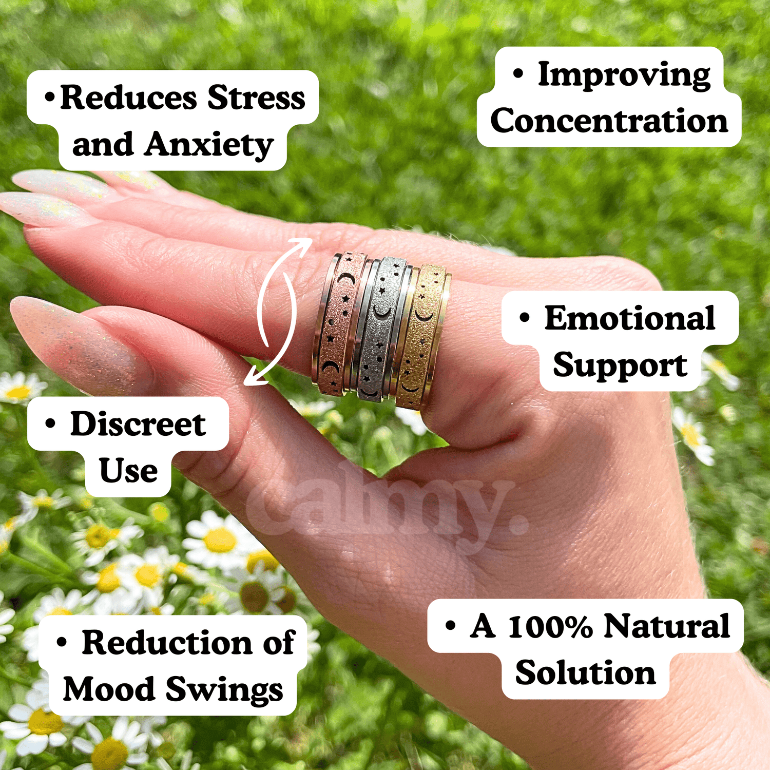 Calmy sensory rings feature a 360° rotation mechanism around your finger, providing instant relief by transforming stress and anxiety into a soothing and discreet action.